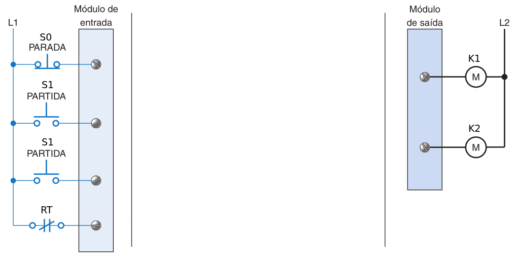 Conexão de Hardware: Os botões de partida e parada são conectados aos módulos de entrada do CLP. A bobina da chave de partida é conectada ao módulo de saída.